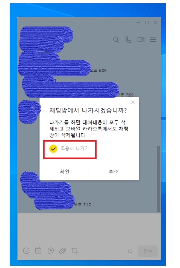 ㄷ) "채팅방 나가기" 팝업창이 표시되면, 이전과 달리 "조용히 나가기" 옵션이 추가된 것을 확인할 수 있습니다. 해당 옵션을 선택하고 [나가기] 버튼을 선택하면, "○○○님이 나갔습니다." 문구가 다른 참여자들에게 표시되지 않습니다.
