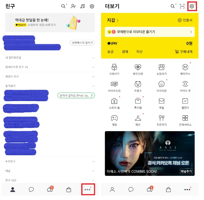 ㄱ) 카카오톡 최신 버전 업데이트 후 화면 하단의 점 3개 [더보기]를 누르고 상단 톱니바퀴 모양의 [설정]을 선택합니다.