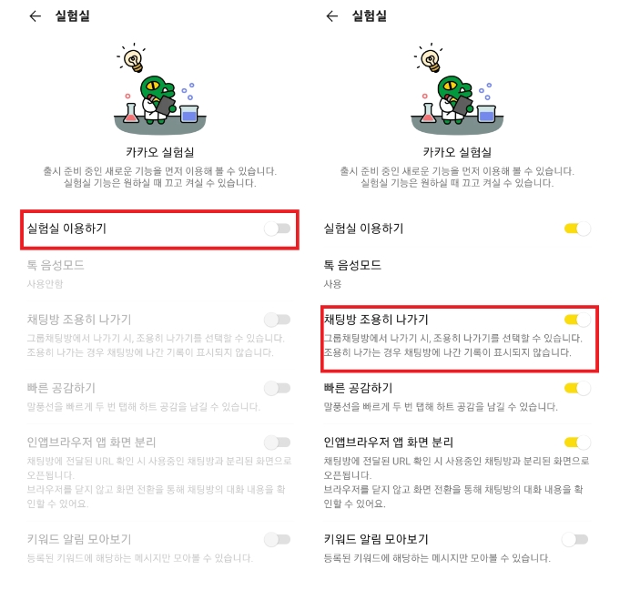 ㄷ) 실험실 화면에서 먼저 "실험실 이용하기" 토글 스위치를 [켬]으로 변경하면, 하단의 실험실 항목들이 활성화됩니다. 그리고 "채팅방 조용히 나가기" 토글 스위치를 [켬]으로 변경합니다.